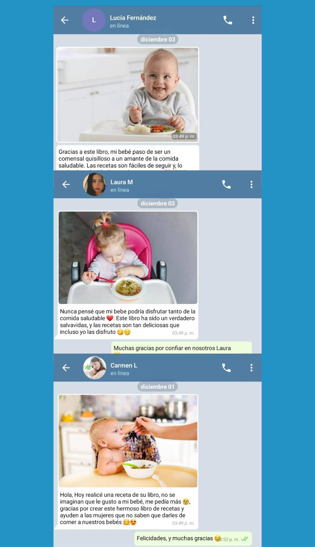 Si dentro de los primeros 7 días desde que adquirís el libro digital con más de 500 recetas para bebés + 4 bonos de regalo, sentís que no superó tus expectativas, solo tenés que escribirnos 📩 y te devolvemos el 100% de tu dinero, sin preguntas ni complicaciones 💸